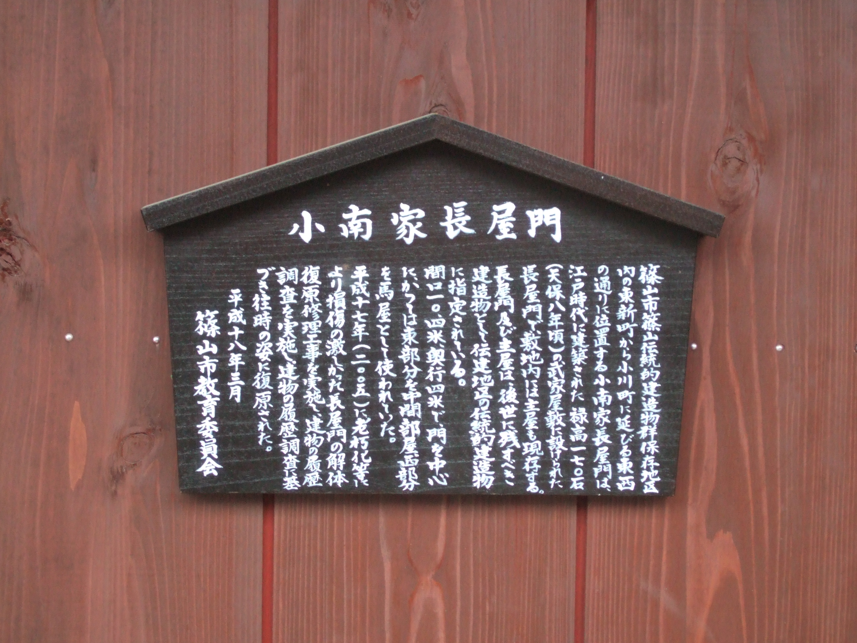 | 420 | 河原町妻入商家群 |  | Noboru Ito | Japan | Hyogo | Sasayama-shi | 小南家長屋門の説明版 |